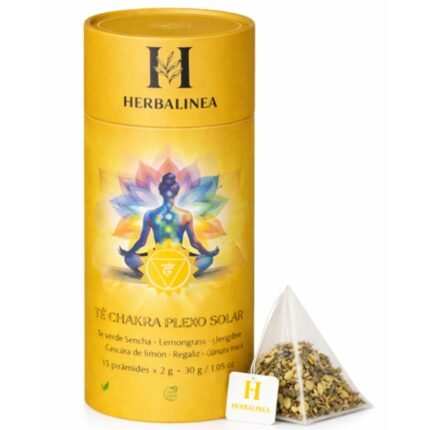 Té Chakra Plexo Solar Premium elaborado con té verde sencha, jengibre, cúrcuma, lemongrass, limón, regaliz y pimienta negra. 15 pirámides naturales para activar la energía, mejorar el ánimo y equilibrar el chakra del poder personal.