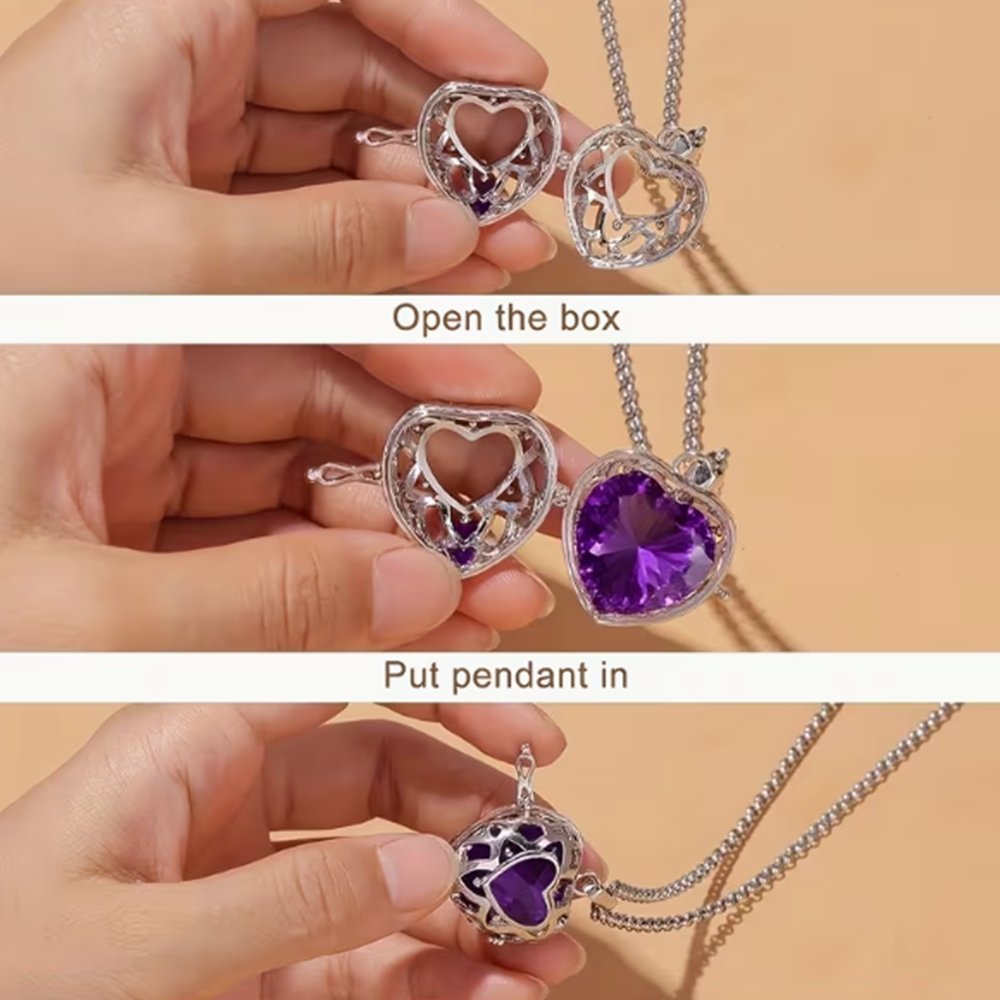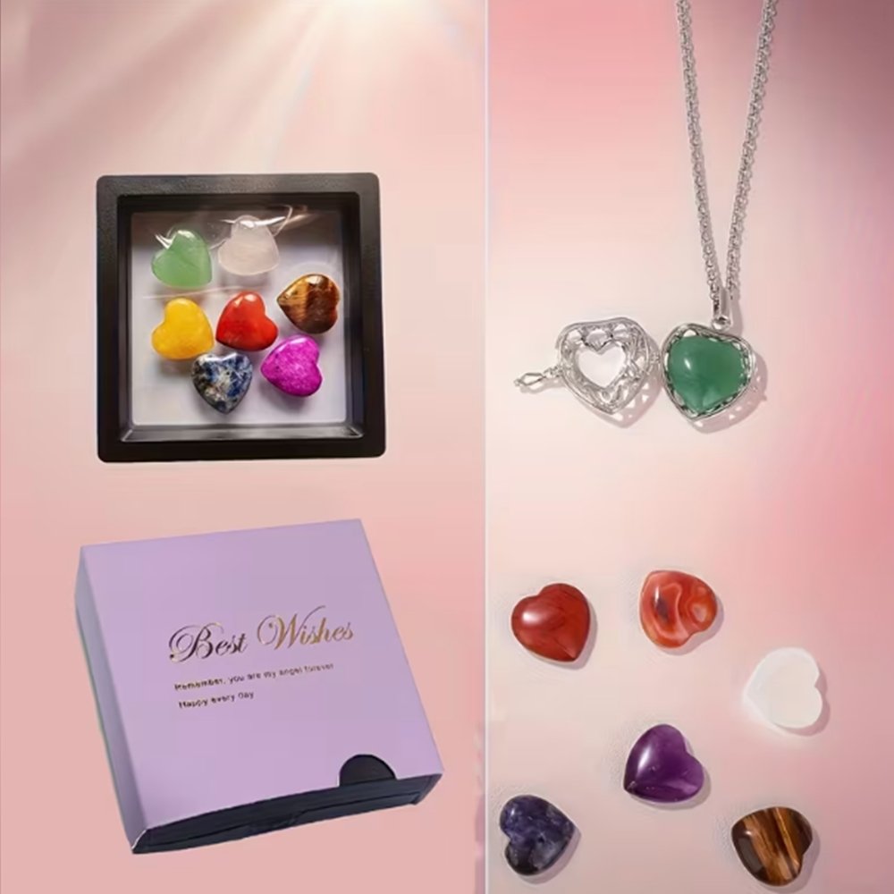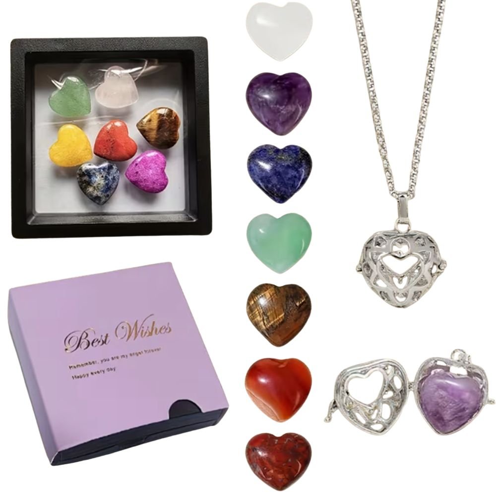 El colgante de corazón está diseñado para abrirse suavemente, permitiendo colocar en su interior cualquiera de las siete piedras según tu estado emocional o espiritual del día. Es un detalle perfecto para regalar a alguien especial o para usar como amuleto personal.