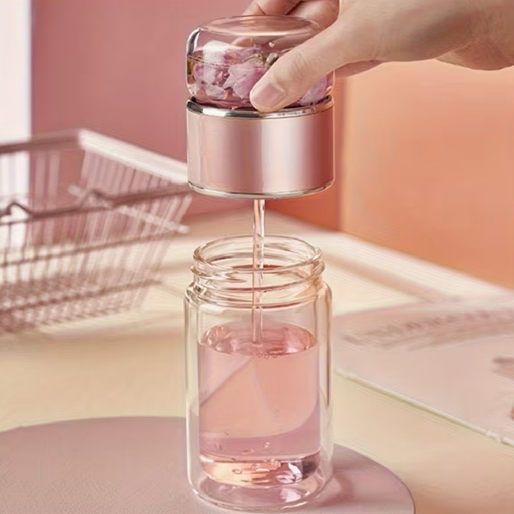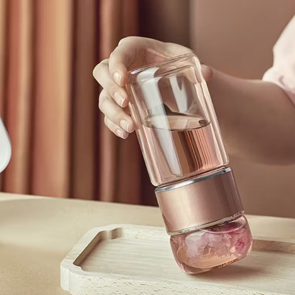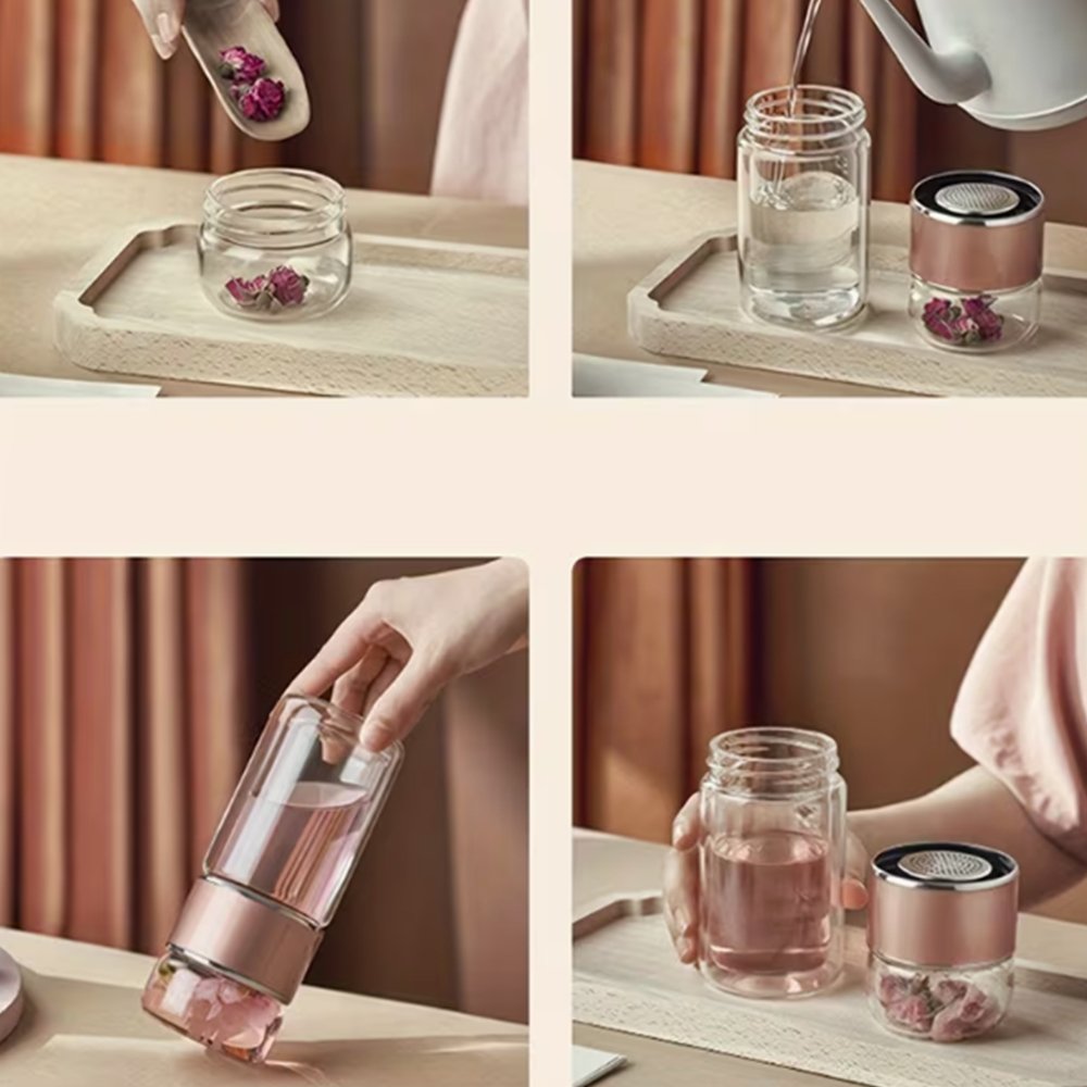 Gracias a su cristal de doble pared, el infusor mantiene la temperatura de la bebida durante más tiempo y protege las manos del calor. Puedes usarlo tanto con bebidas calientes como frías. Su estructura ofrece comodidad y seguridad en cada uso, ya sea en casa, en la oficina o durante actividades de bienestar como yoga o meditación.