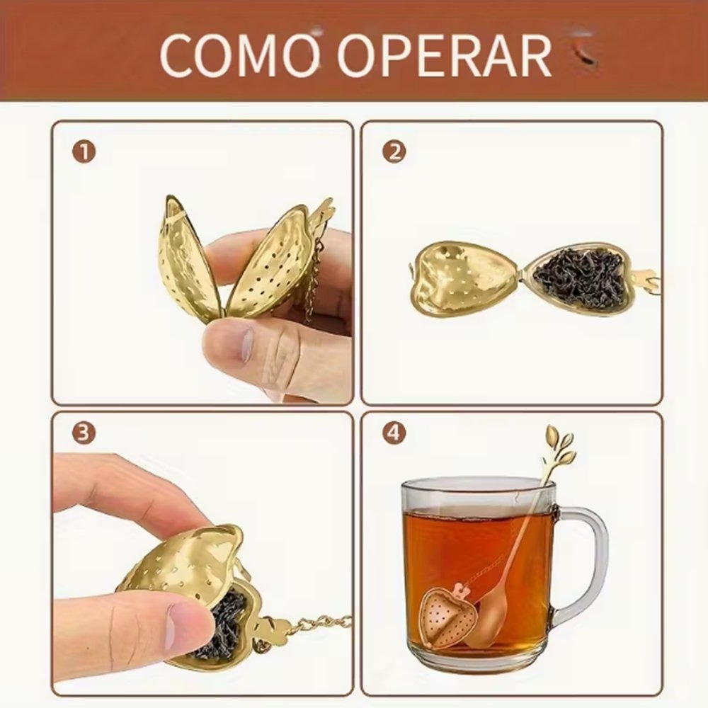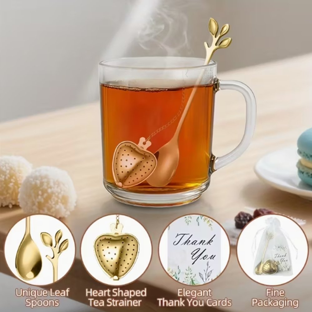 Este infusor de té de acero inoxidable en forma de corazón con cuchara decorativa de hoja transforma la preparación del té en un ritual diario de calma y disfrute. Gracias a su diseño elegante y funcional, convierte cada infusión en un momento especial, donde el cuidado por los detalles marca la diferencia.