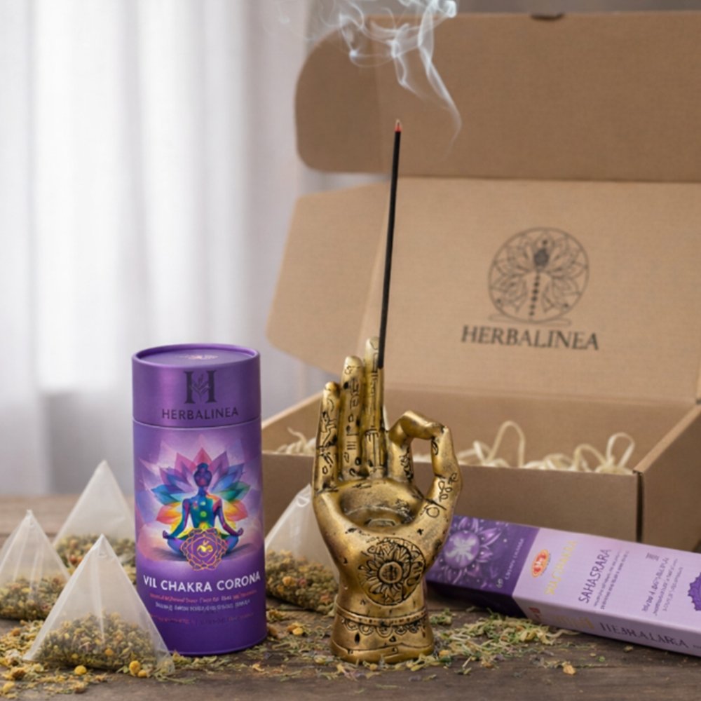 Pack Chakra Corona con té en 15 pirámides, incienso 7 Chakras y porta incienso Mano Mística. Ritual espiritual para elevar la conciencia, fomentar la conexión interior y armonizar la energía.