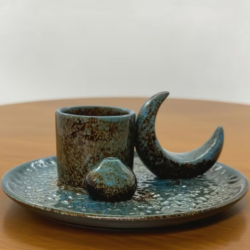 Fabricado en cerámica resistente al calor, presenta un esmaltado azul con matices naturales que evocan el cielo nocturno. La luna creciente simboliza intuición, renovación y ciclos energéticos. Este detalle convierte la pieza en un objeto espiritual con significado.
