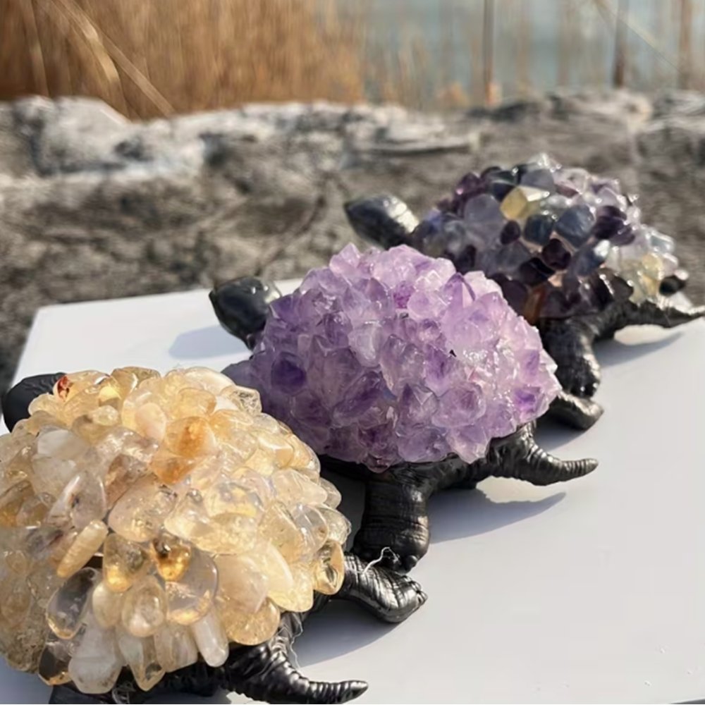 Por otro lado, la tortuga es un símbolo ancestral presente en muchas culturas. Representa la longevidad, la estabilidad, la paciencia y la sabiduría. Gracias a este significado, se considera un amuleto protector ideal para el hogar o el lugar de trabajo. Al unir la tortuga con la amatista, se crea una pieza con un fuerte valor simbólico y decorativo.